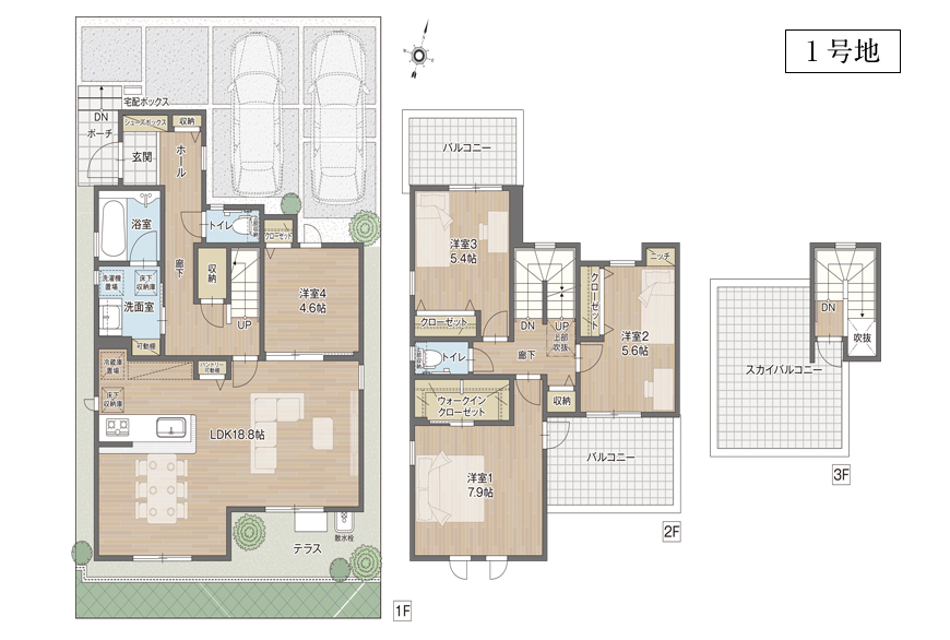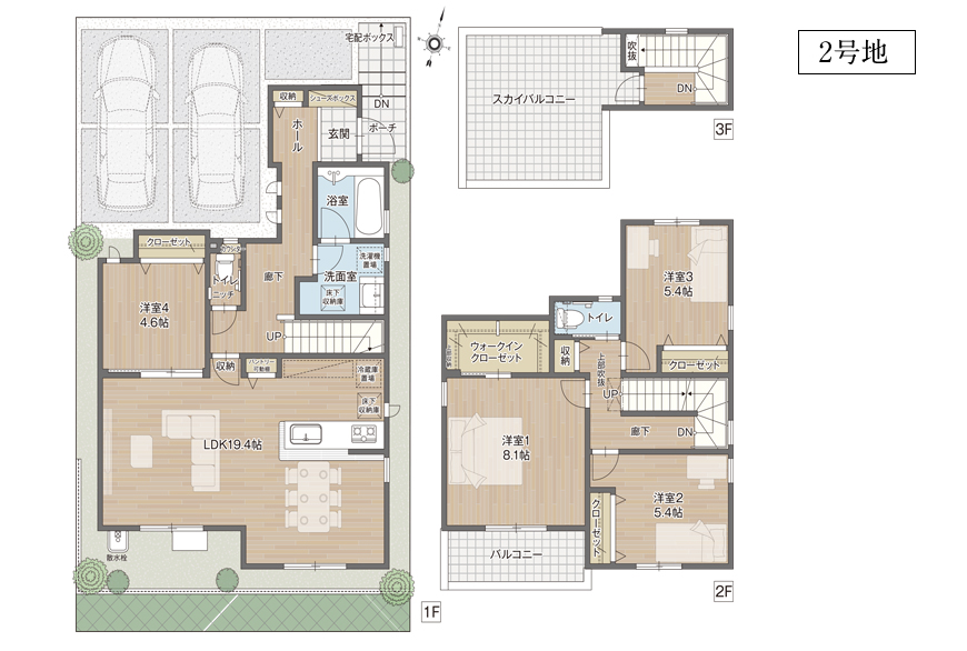 | 販売戸数 | 2戸 | 土地面積 | 1号地:124.86m² 2号地:124.95m² |